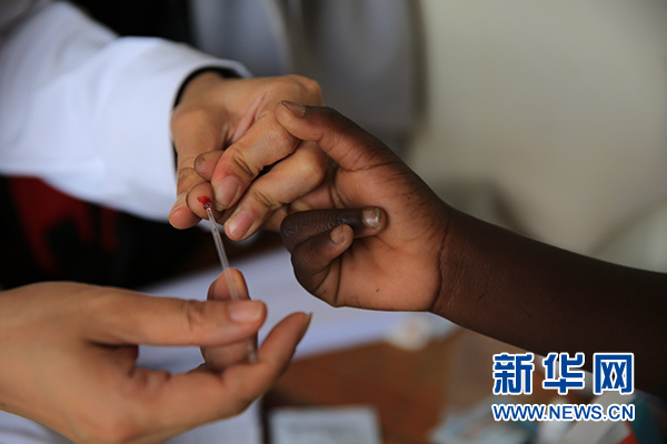 這張2018年12月8日拍攝的照片顯示,在馬拉維南部布蘭太爾市卡迪迪村衛(wèi)生院,第六批中國援馬拉維醫(yī)療隊醫(yī)生在義診活動中為當(dāng)?shù)鼐用駲z測瘧疾。新華社發(fā)(樊江波 攝)