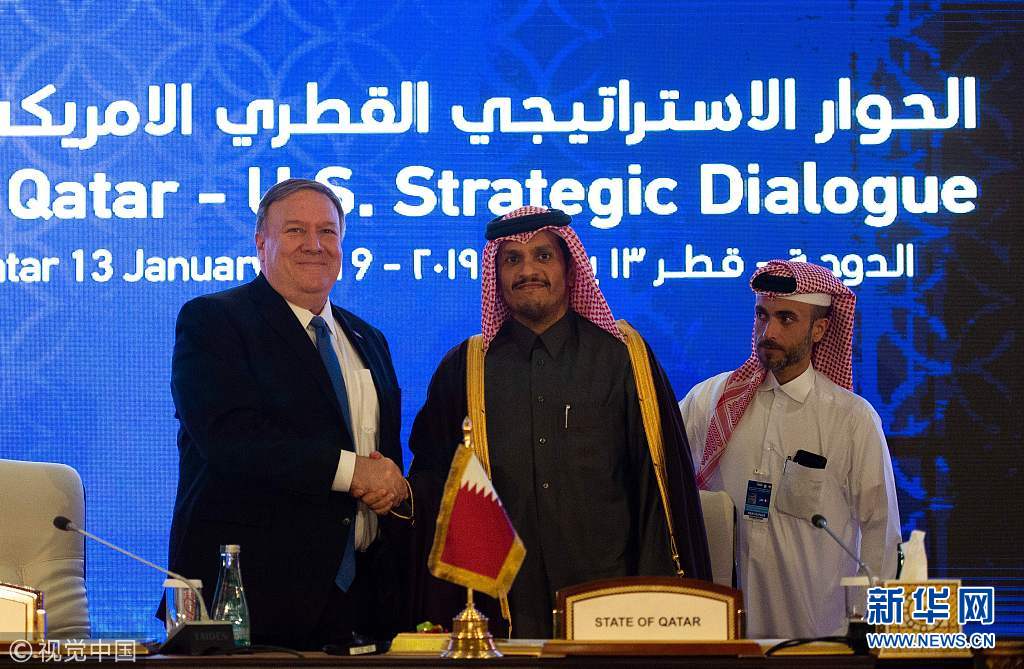 2019年1月13日,卡塔爾多哈,美國國務(wù)卿邁克·蓬佩奧訪問卡塔爾。蓬佩奧與卡塔爾副首相兼外交大臣穆罕默德在多哈的喜來登大酒店簽署了諒解備忘錄和意向聲明并舉行聯(lián)合記者會。蓬佩奧表示,兩國外交部門領(lǐng)導人當天簽署了一份諒解備忘錄,將擴建和改造烏代德美國空軍基地。(圖片來源:視覺中國)