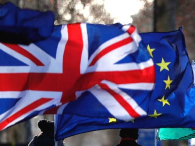 英國國旗(前)和歐盟旗幟。(新華社記者韓巖攝)