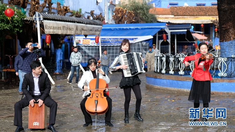 2月1日,在摩洛哥“藍(lán)色小鎮(zhèn)”舍夫沙萬,重慶市歌劇院的演員們進(jìn)行快閃表演。新華社記者陳斌杰 攝