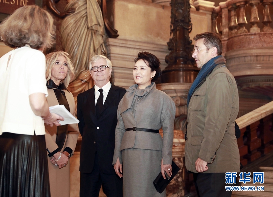 當(dāng)?shù)貢r間3月25日,國家主席習(xí)近平夫人彭麗媛在法國總統(tǒng)夫人布麗吉特陪同下參觀位于巴黎市第九區(qū)的法國巴黎歌劇院。新華社記者 丁林 攝