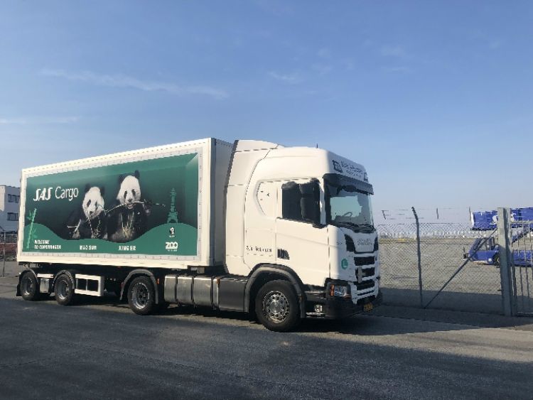 4月4日,在丹麥?zhǔn)锥几绫竟膭P斯楚普國際機場,一輛印有歡迎“星二”和“毛筍”(“毛二”的乳名)來哥本哈根字樣的集裝箱卡車等待運送大熊貓。(新華社發(fā) 何李杰攝)