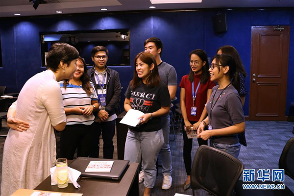 4月12日,在菲律賓馬尼拉,菲律賓總統(tǒng)府新聞部工作人員向菲律賓大學(xué)孔子學(xué)院的老師孟廣潔(左一)詢問(wèn)漢語(yǔ)學(xué)習(xí)的各種問(wèn)題。新華社記者 袁夢(mèng)晨 攝