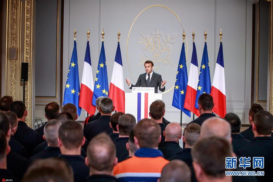 當(dāng)?shù)貢r(shí)間2019年4月18日,法國(guó)巴黎,法國(guó)總統(tǒng)馬克龍?jiān)趷?ài)麗舍宮接見(jiàn)參與巴黎圣母院火災(zāi)救援任務(wù)的消防員。(圖片來(lái)源:東方IC)