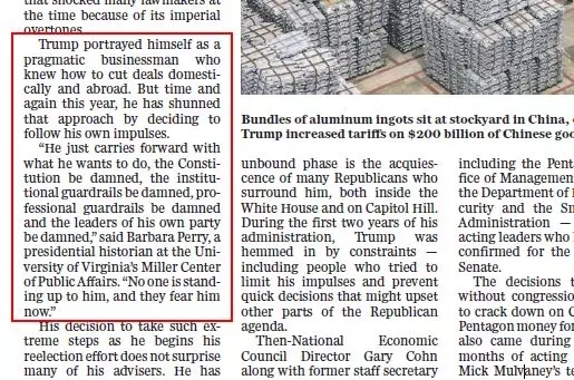 “他把自己描繪成一個務實的商人”,但是“他只是想做什么就做什么,憲法該死、制度該死、專業(yè)防護措施該死,”弗吉尼亞大學米勒公共事務中心的總統(tǒng)歷史學家芭芭拉·佩里說:“他所在黨派的領導人都很可惡,”“沒有人站起來對抗他,他們現(xiàn)在害怕他?!?/strong>