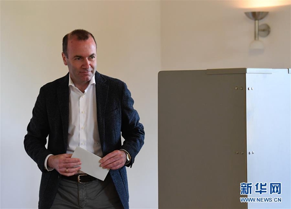 5月26日,在德國(guó)維爾登貝格,歐洲人民黨歐盟委員會(huì)主席候選人曼弗雷德·韋伯在一處投票站準(zhǔn)備投票。新華社記者 逯陽(yáng) 攝