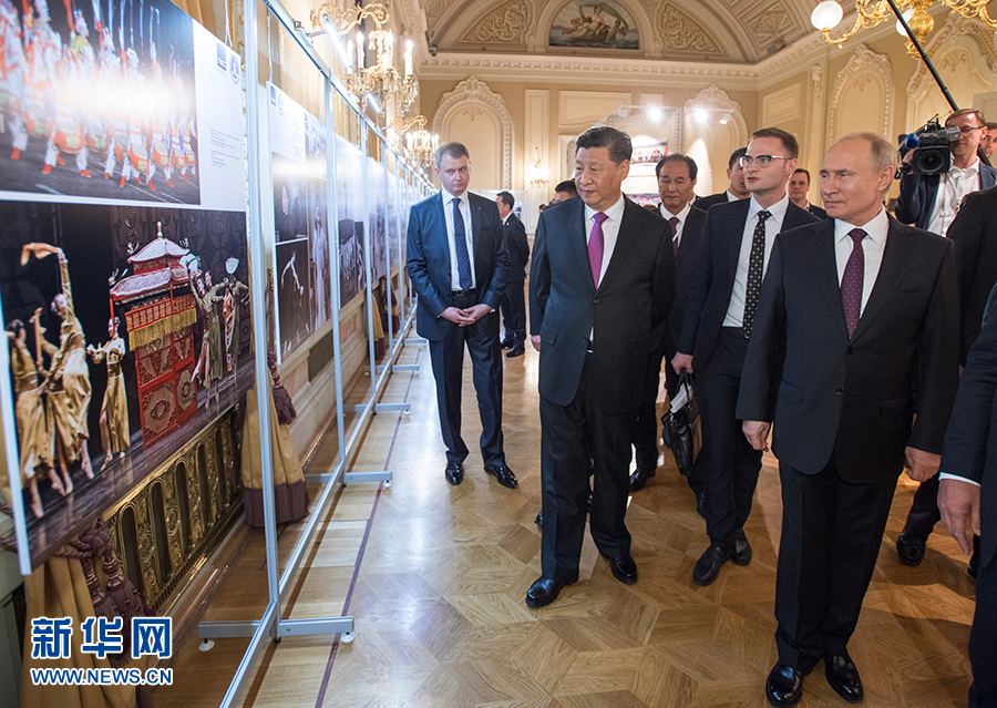 6月5日,國家主席習(xí)近平和俄羅斯總統(tǒng)普京在莫斯科大劇院共同出席中俄建交70周年紀念活動。這是兩國元首共同參觀中俄建交70周年圖片展。 新華社記者 李學(xué)仁 攝