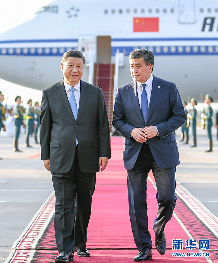 6月12日,國家主席習(xí)近平乘專機(jī)抵達(dá)比什凱克,開始對吉爾吉斯共和國進(jìn)行國事訪問并出席上海合作組織成員國元首理事會第十九次會議。吉爾吉斯斯坦總統(tǒng)熱恩別科夫在舷梯旁熱情迎接。 新華社記者 謝環(huán)馳 攝