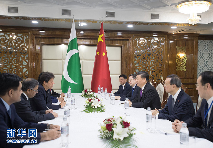 6月14日,國(guó)家主席習(xí)近平在比什凱克會(huì)見(jiàn)巴基斯坦總理伊姆蘭·汗。 新華社記者 李學(xué)仁 攝