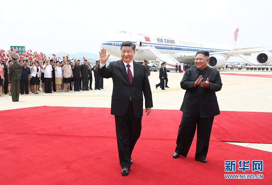 當(dāng)?shù)貢r(shí)間12時(shí)許,習(xí)近平乘坐的專機(jī)抵達(dá)平壤順安機(jī)場(chǎng)。雨后初晴的平壤,天高云淡、氣候怡人,到處郁郁蔥蔥、繁花似錦,整個(gè)城市洋溢著友好熱烈的氣氛。機(jī)場(chǎng)上中朝兩國國旗迎風(fēng)飄揚(yáng),“熱烈歡迎中國共產(chǎn)黨中央委員會(huì)總書記、中華人民共和國主席習(xí)近平同志”“鮮血凝成的朝中兩國人民之間牢不可破的友誼團(tuán)結(jié)萬歲”大幅標(biāo)語高高懸掛,近萬名群眾排列成整齊的隊(duì)伍,有力地?fù)]動(dòng)著花束,以歡快的口號(hào)和熱情的笑容,歡迎尊貴的中國客人到來。朝鮮勞動(dòng)黨委員長、國務(wù)委員會(huì)委員長金正恩和夫人李雪主到機(jī)場(chǎng)迎接。