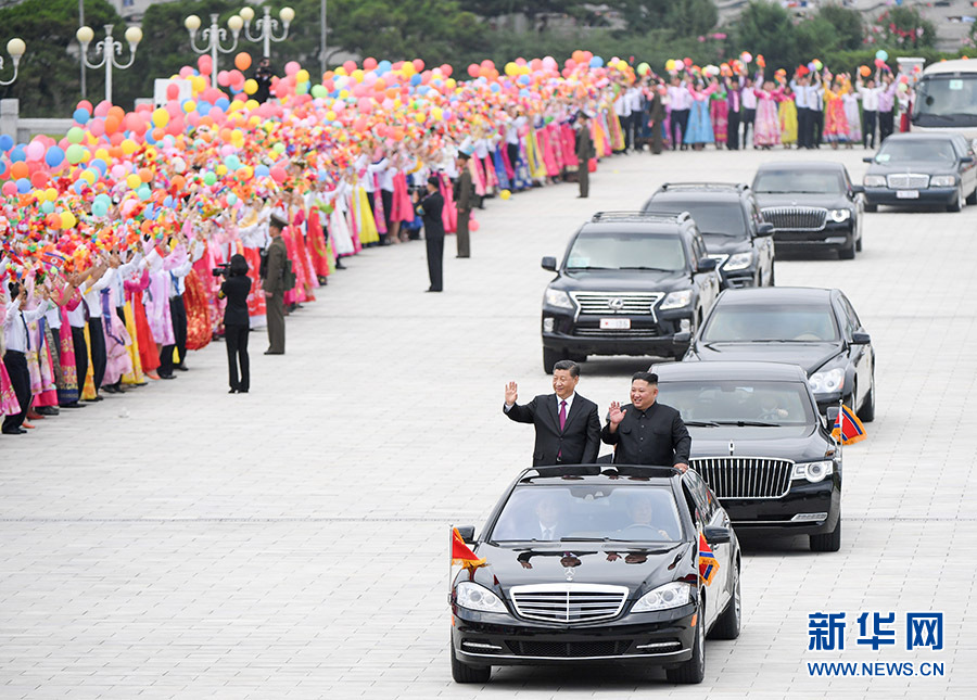 習(xí)近平抵達(dá)黎明大街路口,換乘敞篷車,與金正恩同車前往錦繡山太陽宮廣場(chǎng)。街道兩旁,人山人海,盛況空前。歡迎民眾站在高坡上,從住宅樓的窗臺(tái)上,向中國貴賓歡呼致敬。到處都是熱情的笑臉,友好的歡呼聲不絕于耳。習(xí)近平和金正恩向歡迎的人群頻頻揮手致意。
