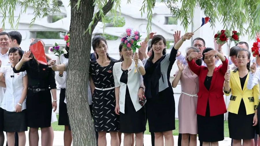 到處都是熱情的笑臉,友好的歡呼聲不絕于耳。習(xí)近平和金正恩向歡迎的人群頻頻揮手致意。
