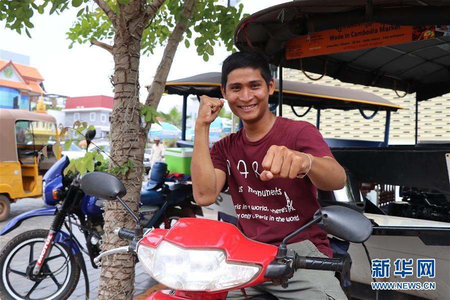 6月11日,在柬埔寨暹粒,孫塞貼農(nóng)騎在嘟嘟車(chē)上對(duì)鏡頭做出武術(shù)動(dòng)作。新華社記者 毛鵬飛 攝