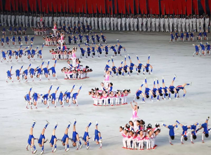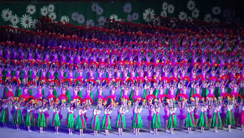 平壤大同江畔,綾羅島“五一”體育場(chǎng)是團(tuán)體操的主要舞臺(tái)。演出以朝鮮民族獨(dú)特的“歌舞之美”、富有活力的團(tuán)體操、嘆為觀止的雜技表演,展現(xiàn)出朝鮮革命與戰(zhàn)爭(zhēng)、政治和軍隊(duì)建設(shè)、民生與經(jīng)濟(jì)發(fā)展以及對(duì)外交往的宏偉畫(huà)卷。