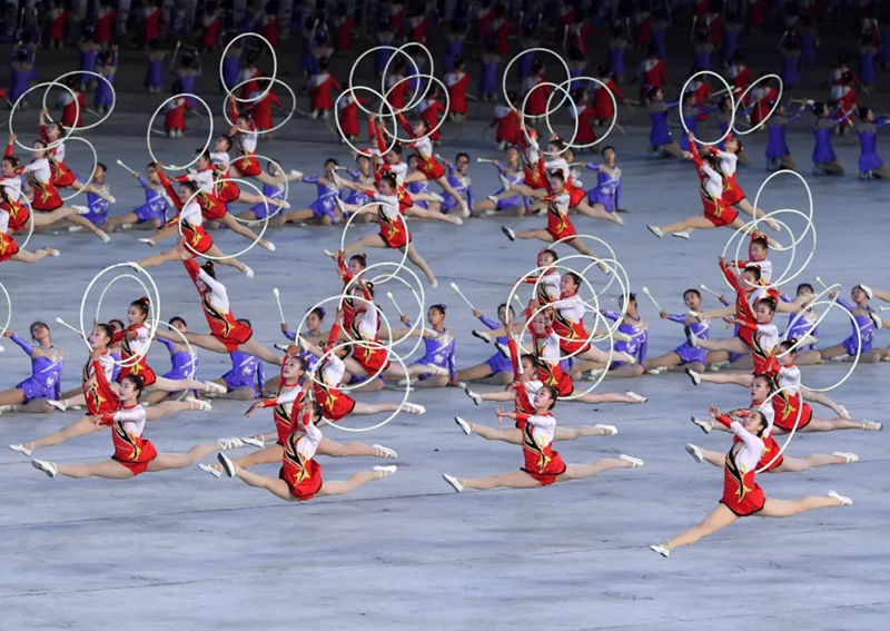 ▲2018年9月9日,演員在平壤綾羅島“五一”體育場(chǎng)表演“輝煌的祖國(guó)”。新華社記者邢廣利攝