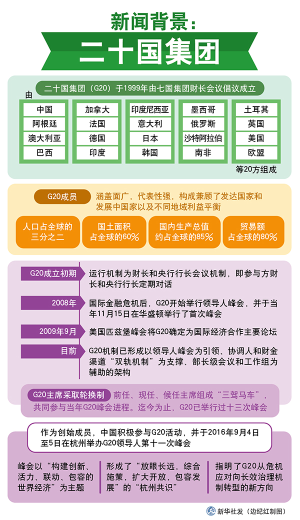 G20于1999年由七國集團(tuán)財長會議倡議成立,由中國、阿根廷、澳大利亞、巴西、加拿大、法國、德國、印度、印度尼西亞、意大利、日本、韓國、墨西哥、俄羅斯、沙特阿拉伯、南非、土耳其、英國、美國以及歐盟等20方組成。