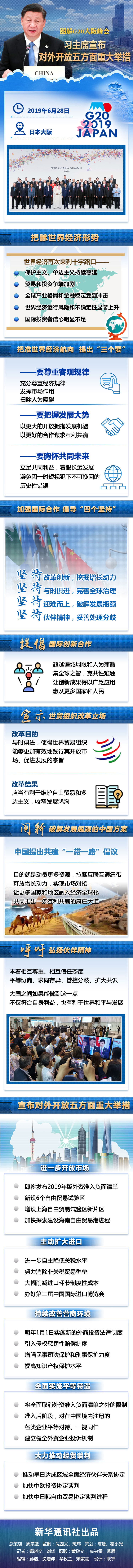 6月28日,習(xí)近平主席在日本大阪舉行的二十國集團(tuán)領(lǐng)導(dǎo)人峰會(huì)上發(fā)表題為《攜手共進(jìn),合力打造高質(zhì)量世界經(jīng)濟(jì)》的重要講話,宣布對外開放五方面重大舉措。