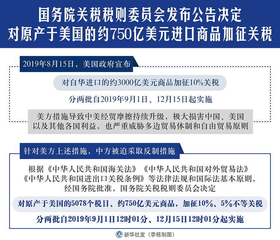 針對(duì)美方上述措施,中方被迫采取反制措施。根據(jù)《中華人民共和國(guó)海關(guān)法》《中華人民共和國(guó)對(duì)外貿(mào)易法》《中華人民共和國(guó)進(jìn)出口關(guān)稅條例》等法律法規(guī)和國(guó)際法基本原則,經(jīng)國(guó)務(wù)院批準(zhǔn),國(guó)務(wù)院關(guān)稅稅則委員會(huì)決定,對(duì)原產(chǎn)于美國(guó)的5078個(gè)稅目、約750億美元商品,加征10%、5%不等關(guān)稅,分兩批自2019年9月1日12時(shí)01分、12月15日12時(shí)01分起實(shí)施。