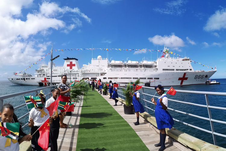2018年10月12日,在多米尼克首都羅索,當(dāng)?shù)貙W(xué)生揮動多中兩國國旗歡迎中國海軍和平方舟醫(yī)院船首次到訪。(新華社發(fā))