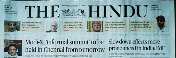 10日清晨6時,當天的《印度教徒報》已送抵讀者手中。頭條為兩國領導人非正式會晤將于明日起在金奈舉行的消息。