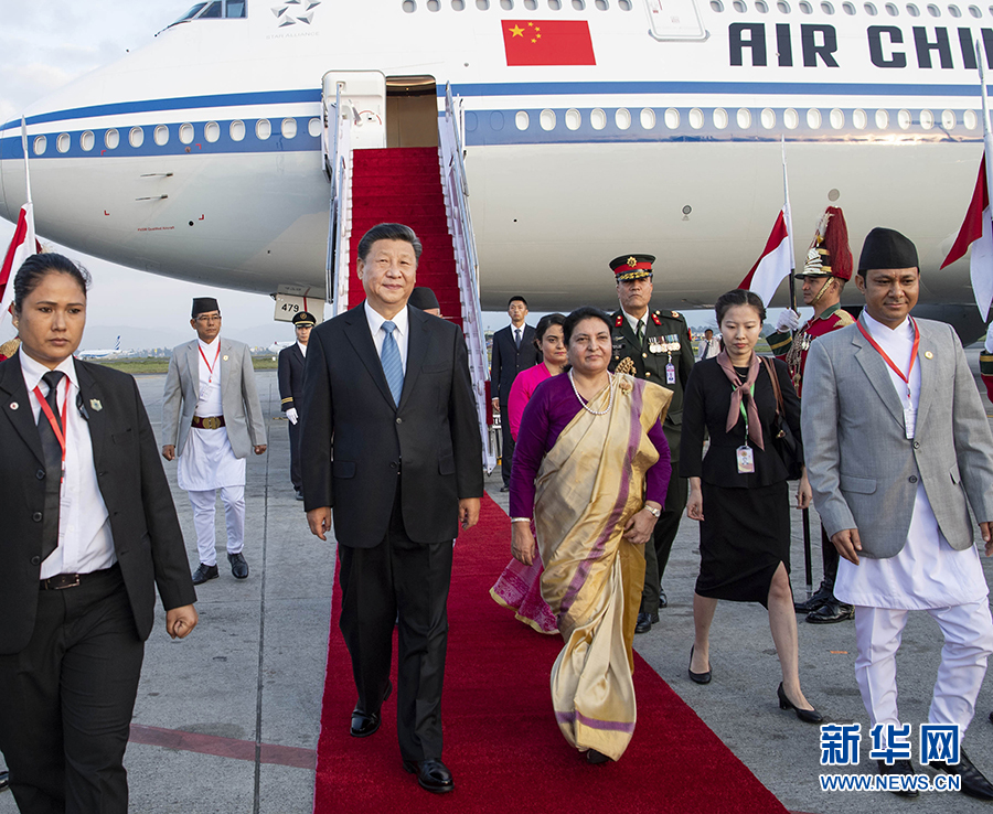 10月12日,國家主席習(xí)近平乘專機(jī)抵達(dá)加德滿都,開始對(duì)尼泊爾進(jìn)行國事訪問。習(xí)近平步出艙門,尼泊爾總統(tǒng)班達(dá)里偕女兒烏莎在舷梯旁熱情迎接。 新華社記者 李濤 攝