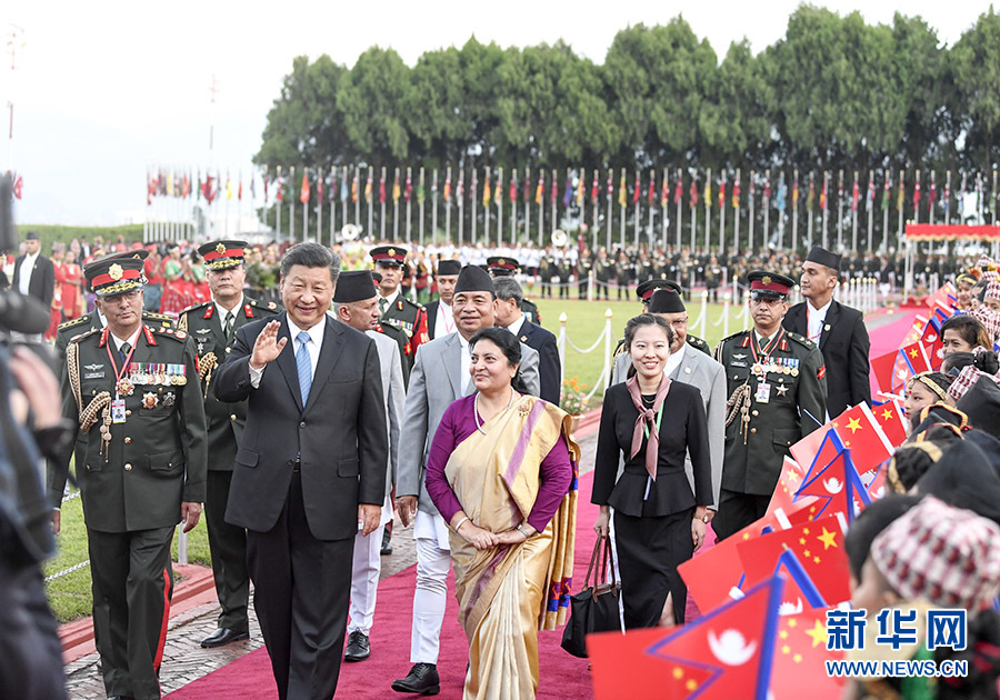 10月12日,國家主席習(xí)近平乘專機(jī)抵達(dá)加德滿都,開始對(duì)尼泊爾進(jìn)行國事訪問。尼泊爾總統(tǒng)班達(dá)里在機(jī)場為習(xí)近平舉行具有濃郁尼泊爾民族特色的歡迎儀式。 新華社記者 鞠鵬 攝