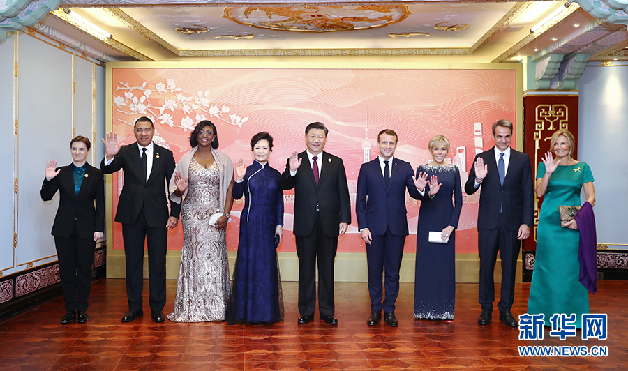 11月4日晚,國(guó)家主席習(xí)近平和夫人彭麗媛在上海和平飯店舉行宴會(huì),歡迎出席第二屆中國(guó)國(guó)際進(jìn)口博覽會(huì)的各國(guó)貴賓。這是宴會(huì)前,習(xí)近平和彭麗媛同法國(guó)總統(tǒng)馬克龍夫婦、牙買加總理霍爾尼斯夫婦、希臘總理米佐塔基斯夫婦、塞爾維亞總理布爾納比奇等外方貴賓合影留念。 新華社記者 鞠鵬 攝
