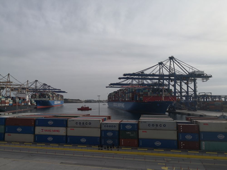 兩艘巨輪,一艘是2萬標(biāo)準(zhǔn)箱級(jí)集裝箱船“中遠(yuǎn)海運(yùn)獅子座”,一艘是1.4萬標(biāo)準(zhǔn)箱級(jí)集裝箱船“中遠(yuǎn)海運(yùn)比利時(shí)”,它們滿載著來自中國(guó)、新加坡、越南、馬來西亞的貨物,從太平洋經(jīng)由蘇伊士運(yùn)河駛?cè)氲刂泻?,將由比港駛往荷蘭鹿特丹和德國(guó)漢堡。