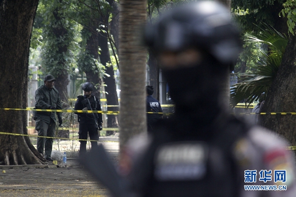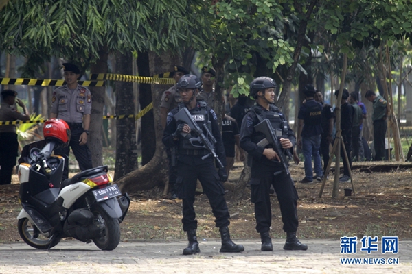 12月3日,在印度尼西亞雅加達(dá),警察在爆炸現(xiàn)場(chǎng)警戒。新華社發(fā)(阿迪蒂亞·伊拉萬(wàn) 攝)