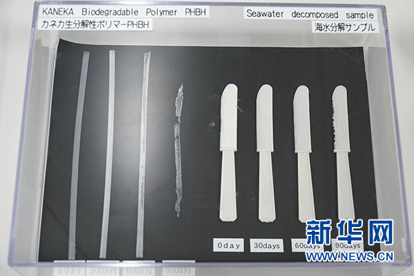 鐘化公司是日本一家知名化學(xué)品公司,記者日前前往鐘化公司的大阪總部,參觀了該公司研發(fā)的可降解聚合物“PHBH”。據(jù)介紹,這種可自然降解聚合物“PHBH”百分之百來源于植物,通過培養(yǎng)攝取植物油的微生物進(jìn)行生產(chǎn)提取,可用于制造各種塑料制品,“PHBH”在自然界中可被多種微生物分解。鐘化公司還實物展示了“PHBH”塑料制品在海水中自然降解的不同階段,例如一根吸管在海水中90天幾乎可被自然降解殆盡。