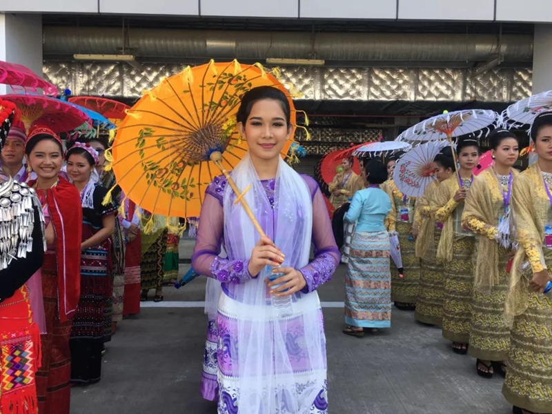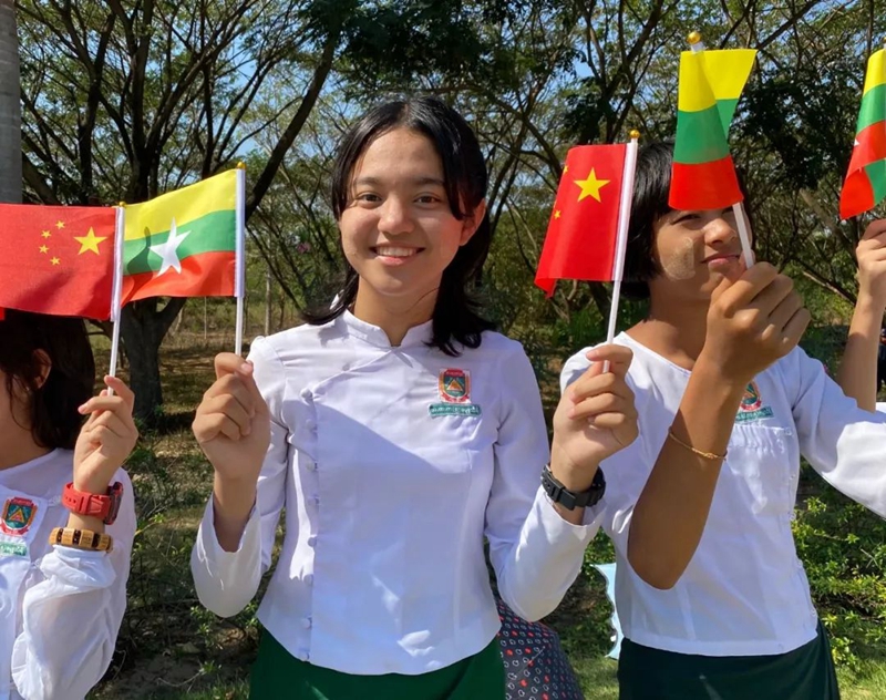 暖陽下,中緬兩國(guó)國(guó)旗招展。