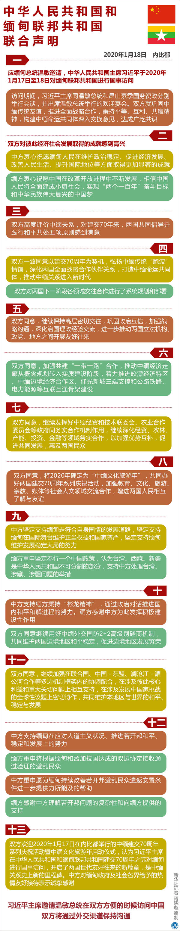 十三、雙方歡迎2020年1月17日在內(nèi)比都舉行的中緬建交70周年系列慶?;顒郁咧芯捨幕糜文陠觾x式,認為習近平主席在中華人民共和國和緬甸聯(lián)邦共和國建交70周年之際對緬甸進行國事訪問,開啟了兩國世代友好往來的新篇章,是中緬關系史上新的里程碑。中方對緬甸政府及社會各界給予的熱情友好接待表示誠摯感謝。