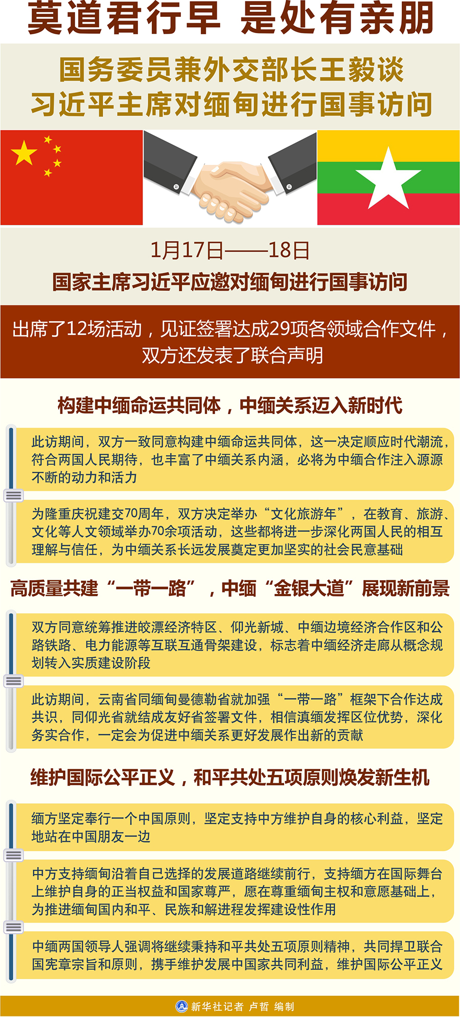 新華社內(nèi)比都1月18日電? 1月17日至18日,國家主席習(xí)近平應(yīng)邀對緬甸進(jìn)行國事訪問。行程結(jié)束之際,國務(wù)委員兼外交部長王毅向隨行記者介紹此訪情況。