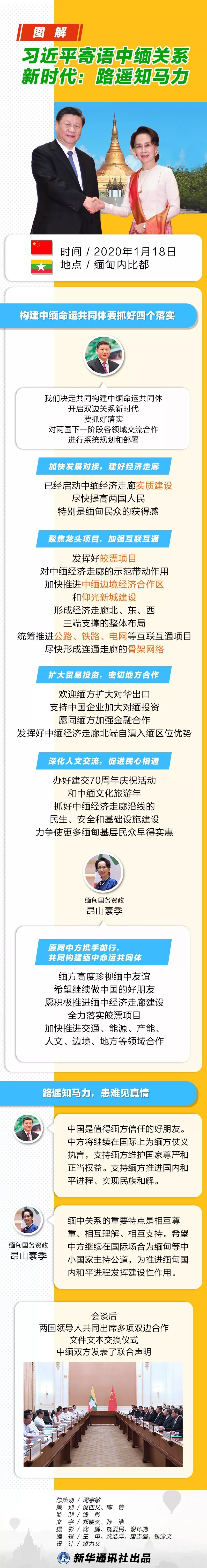 1月18日上午,國家主席習(xí)近平在內(nèi)比都同緬甸國務(wù)資政昂山素季舉行正式會談。雙方?jīng)Q定共同構(gòu)建中緬命運(yùn)共同體,開啟雙邊關(guān)系新時代。習(xí)近平在會談中強(qiáng)調(diào),路遙知馬力,患難見真情。