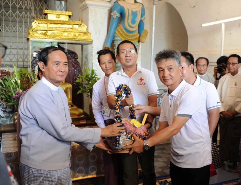 ▲2018年9月,中緬在修復因地震受損的蒲甘佛塔方面的合作正式啟動。圖為2019年8月3日,緬甸總統(tǒng)溫敏(左一)來到蒲甘他冰瑜寺,慰問中方專家及工作組。