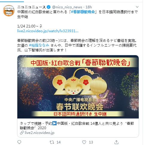 2020年1月24日晚,日本將在線直播中國(guó)春晚。來源:日本視頻網(wǎng)站niconico官方社交媒體賬戶截圖