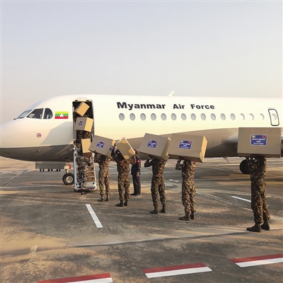 2月25日清晨迎著朝陽,緬甸國防軍使用空軍飛機(jī)運(yùn)送N95級別口罩、護(hù)目鏡、防護(hù)服等醫(yī)療捐助物資前往中國,旨在幫助中國抗擊新冠肺炎疫情,緬甸國防軍總參謀長妙通烏上將、駐緬甸大使陳海、使館武官熊韶?zé)樀仍趦?nèi)比都機(jī)場送行。光明日報(bào)駐仰光記者鹿鋮攝/光明圖片