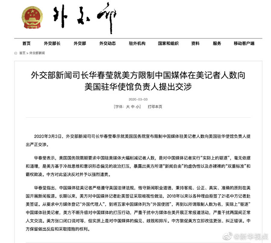 外交部新聞司司長華春瑩3日奉示就美國國務(wù)院宣布限制中國媒體駐美記者人數(shù)向美國駐華使館負(fù)責(zé)人提出嚴(yán)正交涉。華春瑩表示,美國國務(wù)院限期要求中國駐美媒體大幅削減記者人數(shù),是對中國媒體記者實行“實際上的驅(qū)逐”,毫無依據(jù)和道理,是美方基于冷戰(zhàn)思維和意識形態(tài)偏見的政治打壓,暴露出美方所謂“新聞自由”的虛偽性以及赤裸裸的“雙重標(biāo)準(zhǔn)”和霸權(quán)欺凌。中方對此堅決反對并予以強(qiáng)烈遣責(zé)。中方敦促美方立即改弦更張、糾正錯誤。中方保留做出反應(yīng)和采取措施的權(quán)利。(記者朱超)