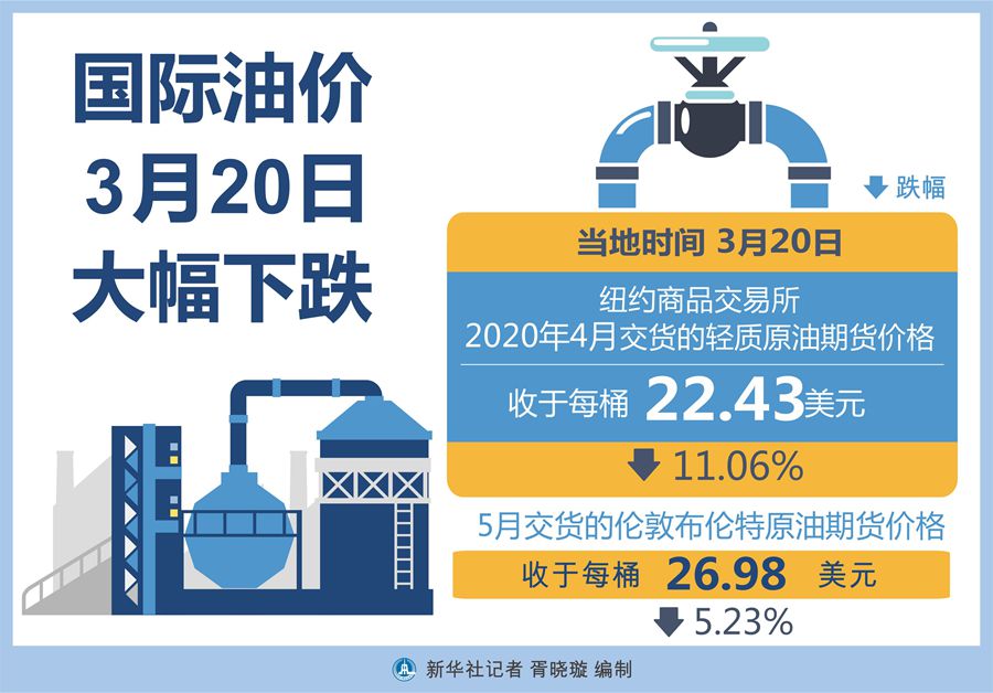 截至當(dāng)天收盤,紐約商品交易所4月交貨的輕質(zhì)原油期貨價格下跌2.79美元,收于每桶22.43美元,跌幅為11.06%。5月交貨的倫敦布倫特原油期貨價格下跌1.49美元,收于每桶26.98美元,跌幅為5.23%。
