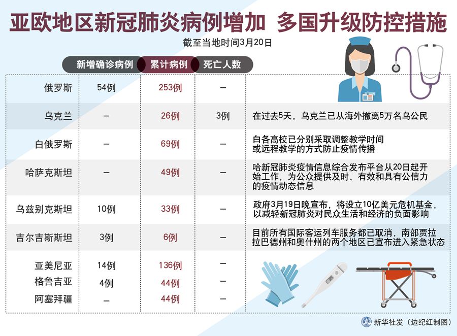 新華社莫斯科3月21日電 綜合新華社駐亞歐地區(qū)記者報(bào)道:亞歐地區(qū)新冠肺炎確診病例20日繼續(xù)增加,多國采取暫??瓦\(yùn)等防控措施。