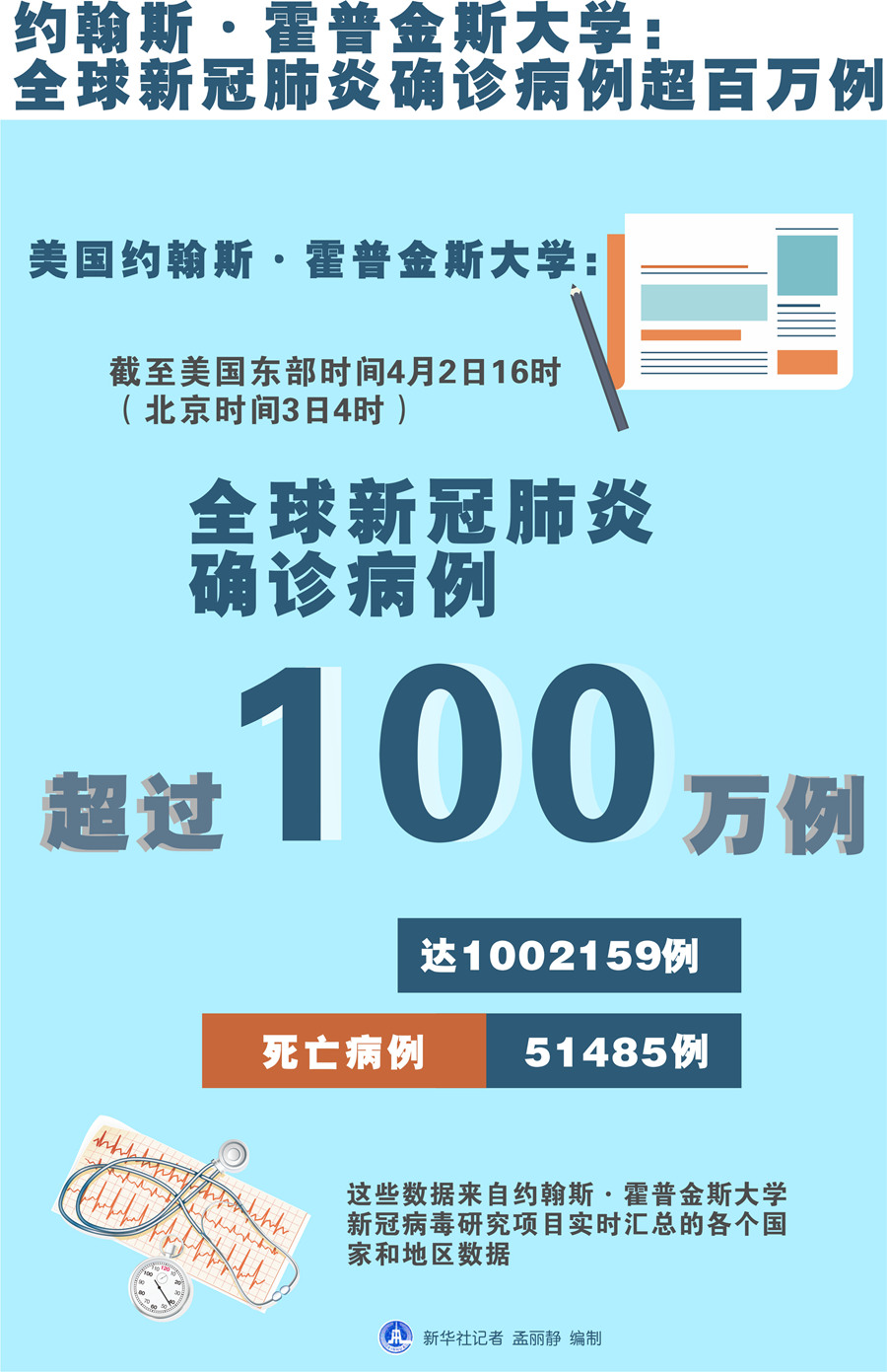 美國約翰斯·霍普金斯大學(xué):截至美國東部時間2日16時(北京時間3日4時),全球確診病例達(dá)1002159例,死亡病例為51485例。美國確診病例增至236339例,是目前確診病例最多的國家,其死亡病例為5648例。