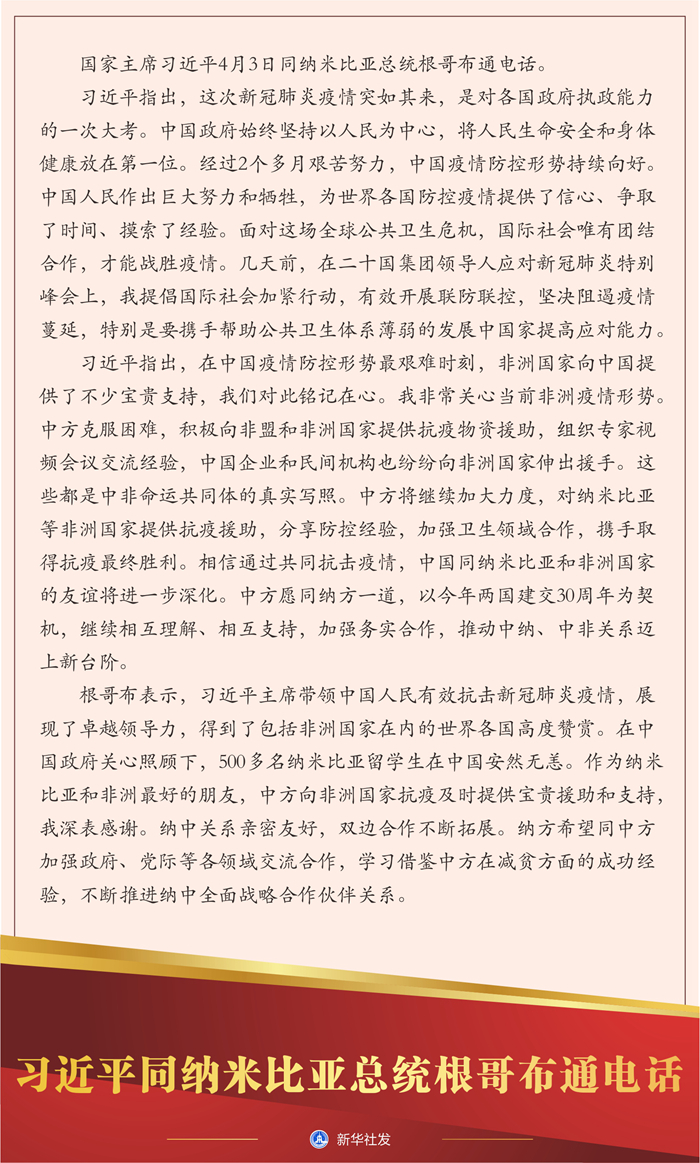 圖表:習(xí)近平同納米比亞總統(tǒng)根哥布通電話 新華社記者 陳琛 編制