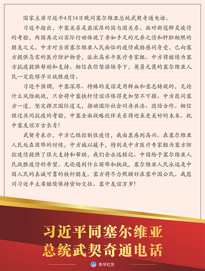 習(xí)近平指出,中塞關(guān)系是最深厚的國與國關(guān)系。面對新冠肺炎疫情的考驗,兩國再次以實際行動體現(xiàn)了親如手足的兄弟之情和肝膽相照的朋友之義。中方對當(dāng)前塞爾維亞人民面臨的疫情威脅感同身受,已向塞方提供急需的醫(yī)療防護(hù)物資,派出高水平醫(yī)療專家組。中方將繼續(xù)為塞方抗疫提供幫助和支持。相信在你堅強(qiáng)領(lǐng)導(dǎo)下,英勇無畏的塞爾維亞人民一定能夠早日戰(zhàn)勝疫情。