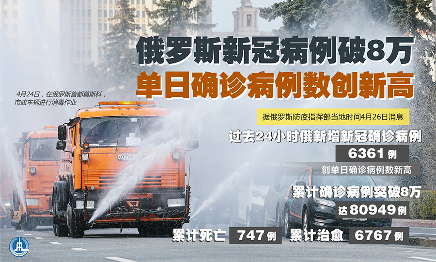 新華社莫斯科4月26日電(記者魯金博)據俄羅斯防疫指揮部26日消息,過去24小時俄新增新冠確診病例6361例,創(chuàng)單日確診病例數新高,累計確診病例突破8萬,達80949例。