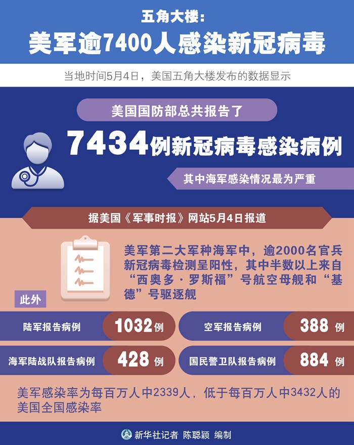 新華社華盛頓5月4日電(記者徐劍梅 鄧仙來)美國五角大樓4日發(fā)布的數(shù)據(jù)顯示,截至目前,美國國防部總共報(bào)告了7434例新冠病毒感染病例,其中海軍感染情況最為嚴(yán)重。