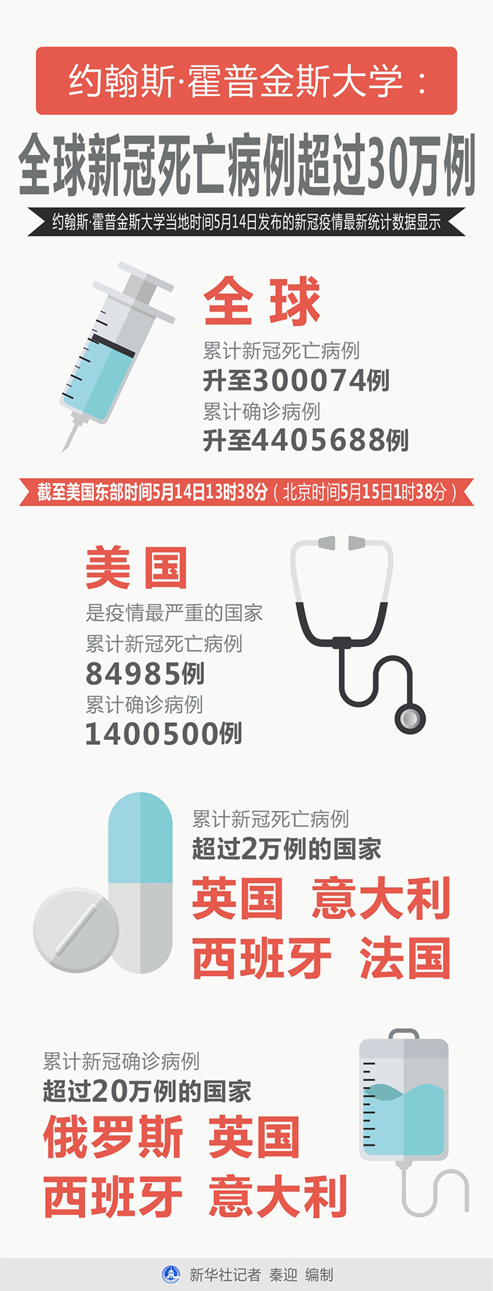 新華社北京5月15日電 ?14日全球疫情簡報:美研究機構統(tǒng)計美國新冠確診超140萬 全球病亡超30萬