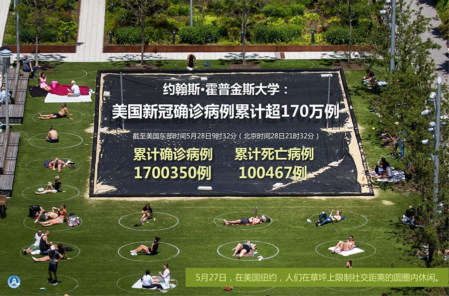 新華社紐約5月28日電 美國約翰斯·霍普金斯大學(xué)28日發(fā)布的新冠疫情最新統(tǒng)計數(shù)據(jù)顯示,截至美國東部時間28日9時32分(北京時間28日21時32分),美國累計確診病例達1700350例,累計死亡病例達100467例。