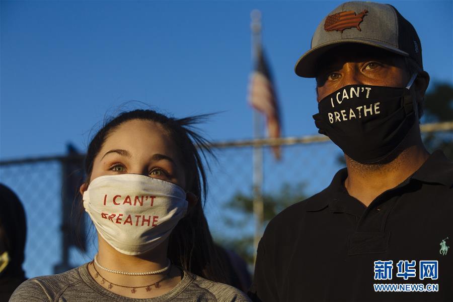 5月30日晚,在美國明尼蘇達(dá)州明尼阿波利斯市,抗議者面戴寫有“我無法呼吸”的口罩,參加抗議活動。新華社發(fā)(安格斯·亞歷山大攝)