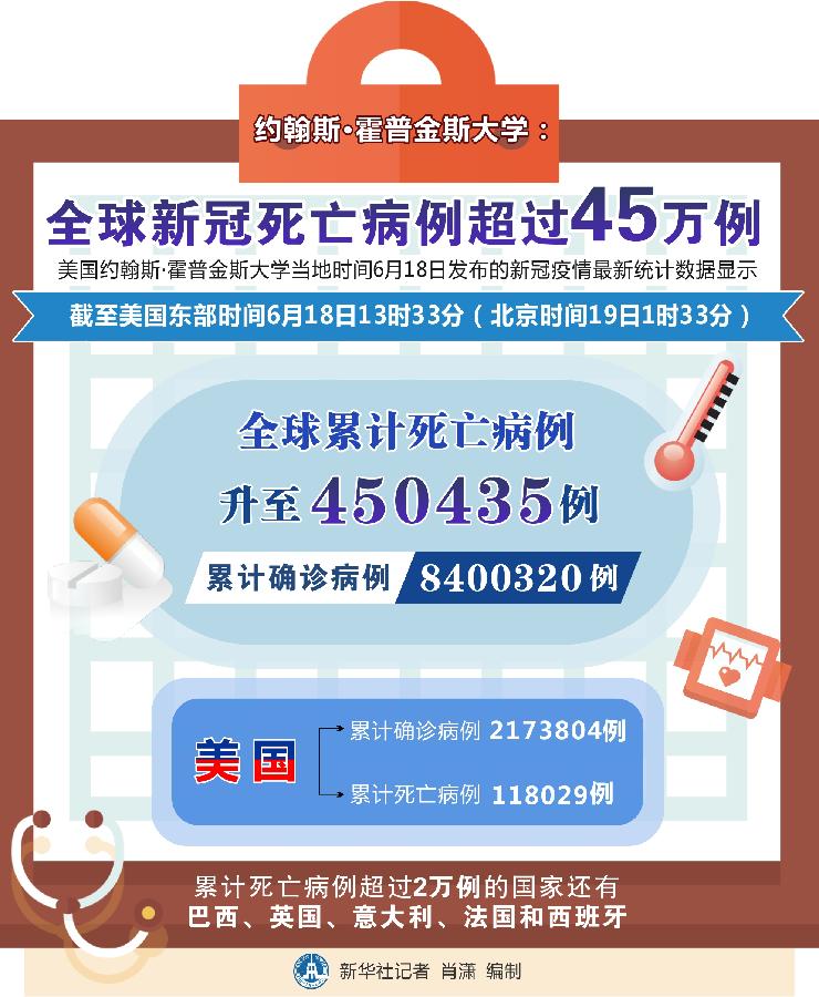 新華社紐約6月18日電 美國約翰斯·霍普金斯大學(xué)18日發(fā)布的新冠疫情最新統(tǒng)計數(shù)據(jù)顯示,全球累計死亡病例超過45萬例。