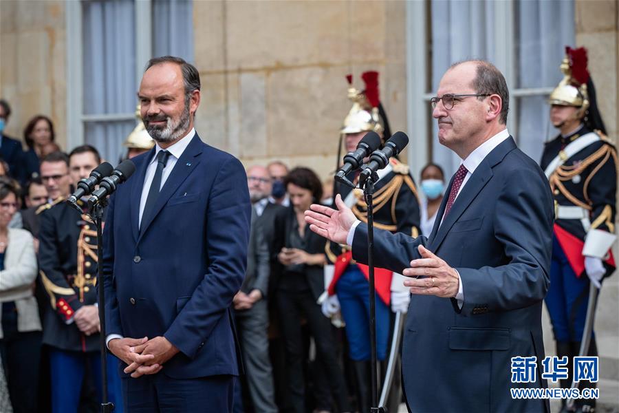 7月3日,在法國(guó)巴黎總理府,卸任總理愛(ài)德華·菲利普(左)與新任總理讓·卡斯泰出席權(quán)力交接儀式。新華社發(fā)(奧雷利安·莫里薩爾 攝)